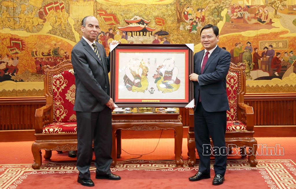 Bí thư Tỉnh ủy Nguyễn Anh Tuấn tặng tranh dân gian Đông Hồ cho Đại sứ Cuba tại Việt Nam Rogelio Polanco Fuentes