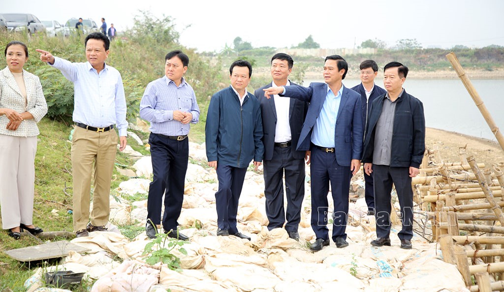 Phó Chủ tịch UBND tỉnh Lê Xuân Lợi kiểm tra sự cố sụt lún, sạt trượt mái công trình thuỷ lợi Ngũ Huyện Khê, xã Phú Lâm (Tiên Du).